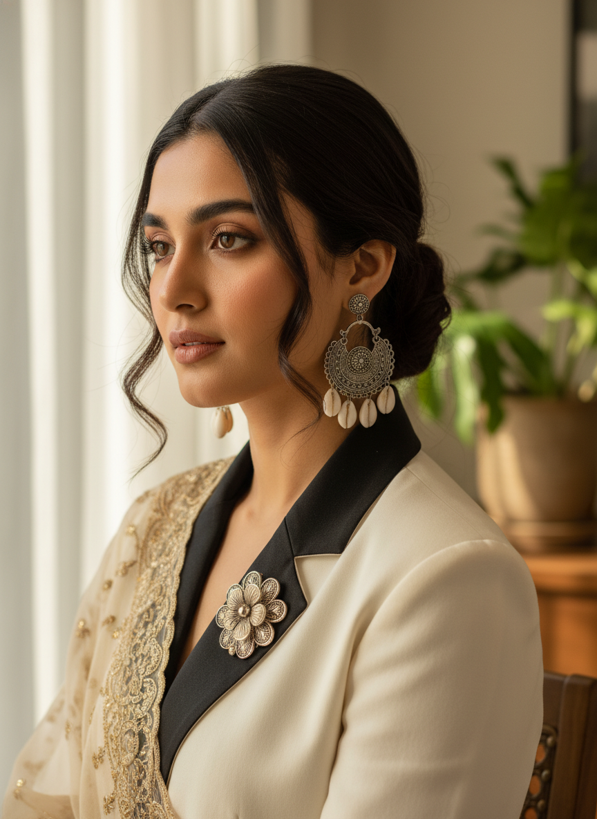 The antique silver-tone finish enhances the handcrafted patterns, giving each pair a rich, vintage-inspired look. Versatile and eye-catching, these earrings pair effortlessly with sarees, kurtas, lehengas, or fusion outfits — making them perfect for festive occasions, casual styling, and special gatherings alike.